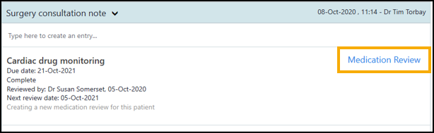 Note - Medication Reviews are only available for patients registered at Cegedim Primary Care Solution practices, to record a Medication Review for a patient registered at an EMIS or TPP practice, use the Clinical Term. -