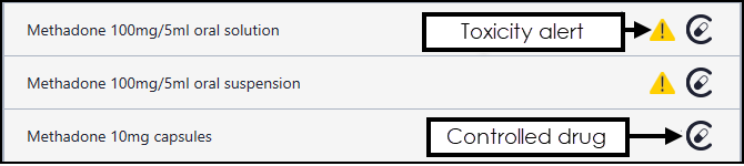 When selecting a drug, a symbol displays if the drugs has a toxicity warning: