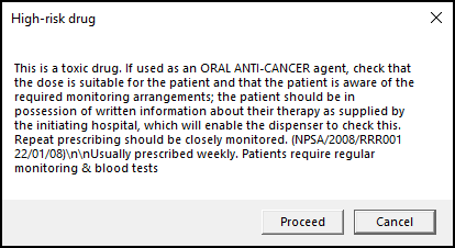 On selection a detailed toxicity warning displays, select Proceed to prescribe.