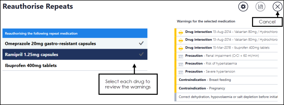 to proceed. - Select each drug to review the prescriber warnings. If you wish to change the medication, select Cancel return to the previous screen: