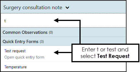 Training Tip - The following terms also trigger the Test Request form, tes, te, test request, test req, investigation, cxr, blood, mri, msu, stool, ix, uss, ct, swab, xry, x-ray. - Select Test Request and the Test Request quick entry form displays: