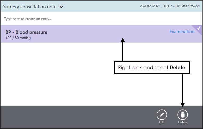 Note - You can only delete data in open Encounters, once closed and synchronised with the patient record an entry cannot be deleted.