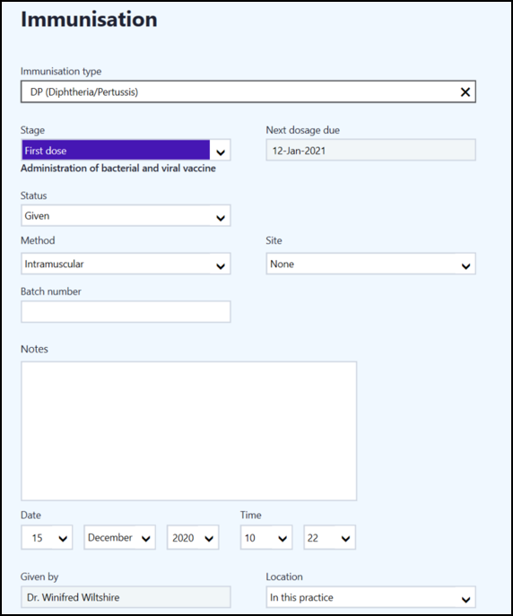 Note - From Vision 3 release DLM 830 compound immunisations are split in to individual immunisations when written back to Vision 3. In the meantime, if you are a Vision 3 practice, you may need to check any reports to ensure immunisation data recorded in Vision Anywhere is included.Stage - Select from the available list as appropriate.