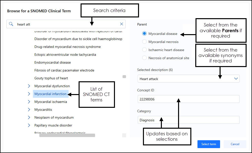 - SNOMED CT terms list - Displays on the left, the most appropriate SNOMED CT term is highlighted by default. If the highlighted term is not appropriate, select Expand