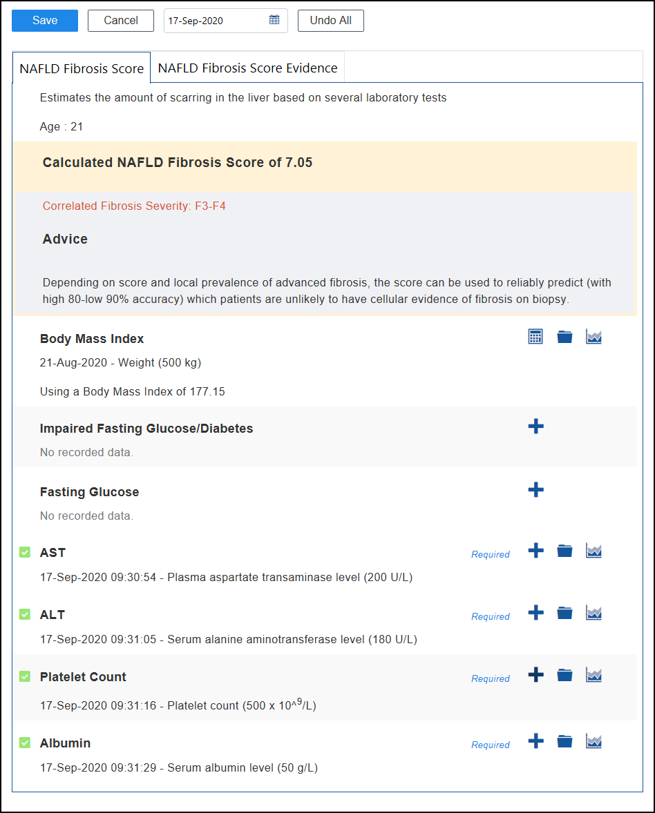 - NAFLD Fibrosis Score - Displays the latest results and enables you to select Add