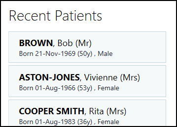 From your Home screen, Recent Patients displays your five most recently opened patients; these are retained across your sessions:
