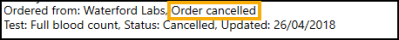 If one test is cancelled in a multi-test request, the encounter entry automatically updates to mark that specific test as Cancelled.