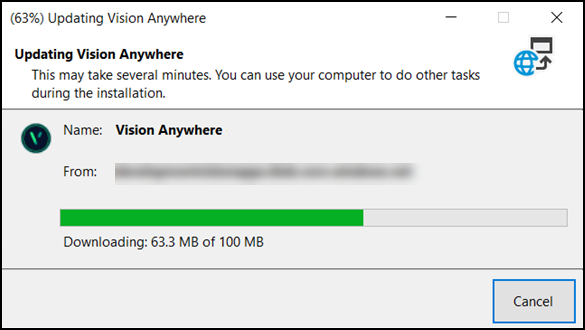 Note - If you do not want to install the update immediately, you can select Skip for up to two weeks after a new version is released. After two weeks and update becomes mandatory and the Skip option is no longer available. We recommend you install an update as soon as you are able to ensure you have access to any new and improved features. - The Updating Vision Anywhere screen displays with a progress bar for the download: