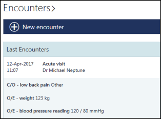 The Encounter section of Patient Summary view displays details of the last encounter: