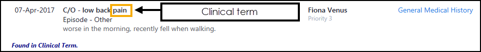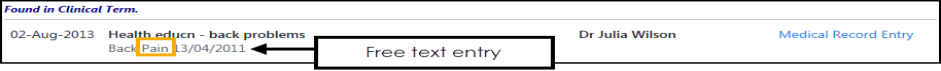 The Patient Record Search screen displays listing all matching coded and free text entries, for example, the following show the results of a search on "pain".