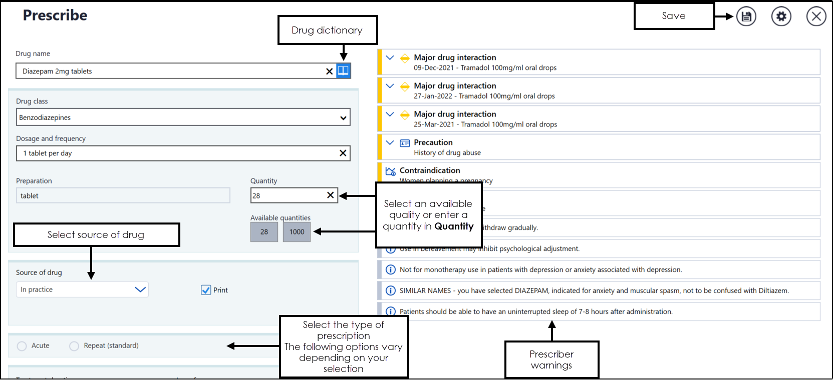 Note - When adding a prescription for a controlled drug item, a warning displays in orange if you enter more than 30 days supply into Quantity. This utilises the calculated daily dose.