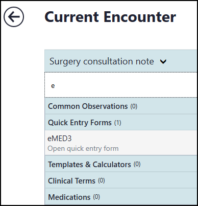 - Select the appropriate patient and open an Encounter with the appropriate consultation type, see Selecting a Patient and Adding an Encounter if required.