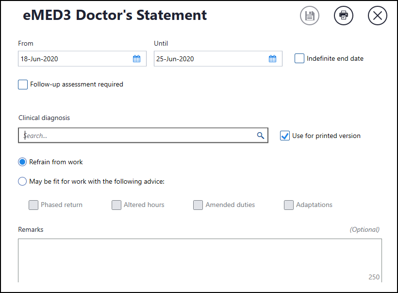 - Remarks - Mandatory if you select May be fit for work with the following advice, enter advice as required.