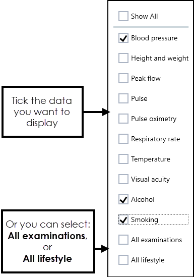 - Select the category of data required, for example Lifestyle and Examinations.