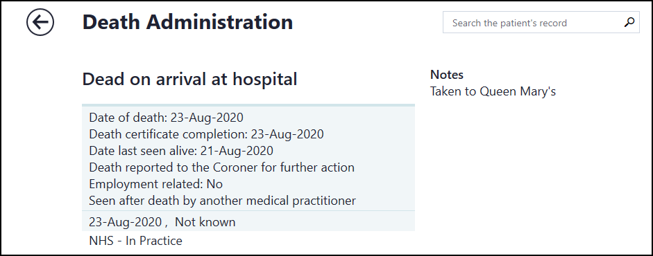 - Search the Patient Record - Enter death into Search the Patient Record and the smart list returns any matching entries, select the entry required and the Patient Record Search screen displays with those entries.
