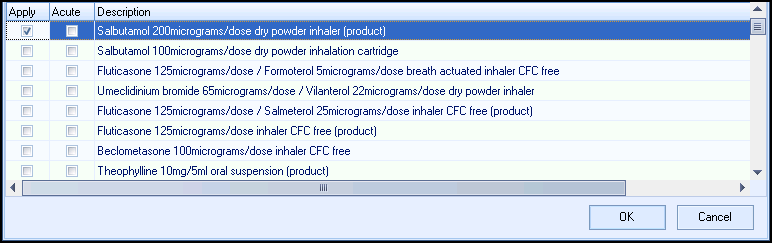 - If you want to add therapy – Tick the Apply box. If the drug is to be prescribed as an acute prescription select Acute, if this box is not selected the drug is recorded as a Repeat.