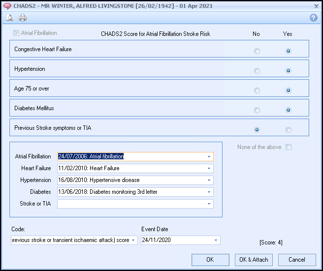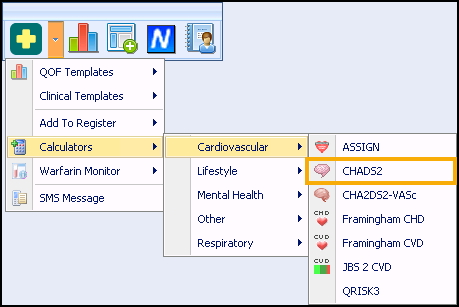 - From Consultation Manager, select Vision+ from the floating toolbar and select Calculators - Cardiovascular - CHADS2: