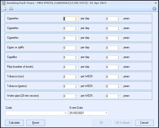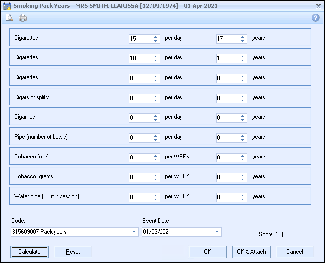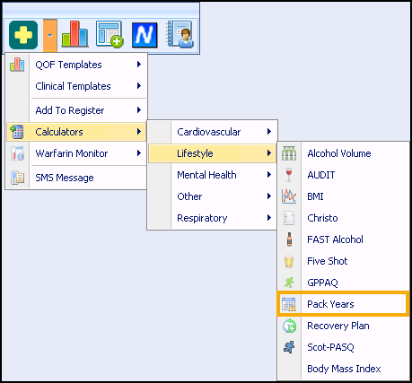 - From Consultation Manager, select Vision+ from the floating toolbar and select Calculators - Lifestyle - Pack Years: