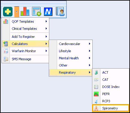 - From Consultation Manager, select Vision+ from the floating toolbar and select Calculators - Respiratory - Spirometry.