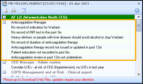.Note - By default QOF alerts display when you select a patient in Consultation Manager. To combine both QOF and non-QOF alerts, see Options - Indicators. - The Alert screen displays the Anticoagulation Manager sub-category headings expanded to show outstanding/missing anticoagulation data: