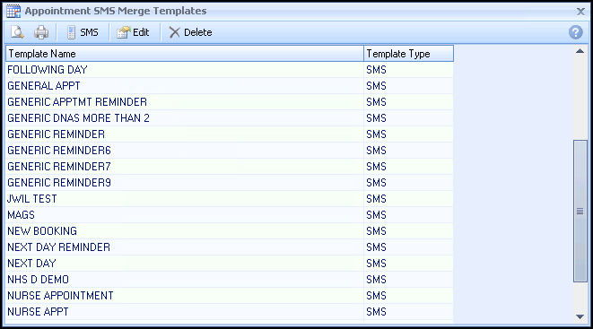 . - The Appointment SMS Merge Templates screen displays and lists existing templates for editing or allows you to add new appointment SMS templates: