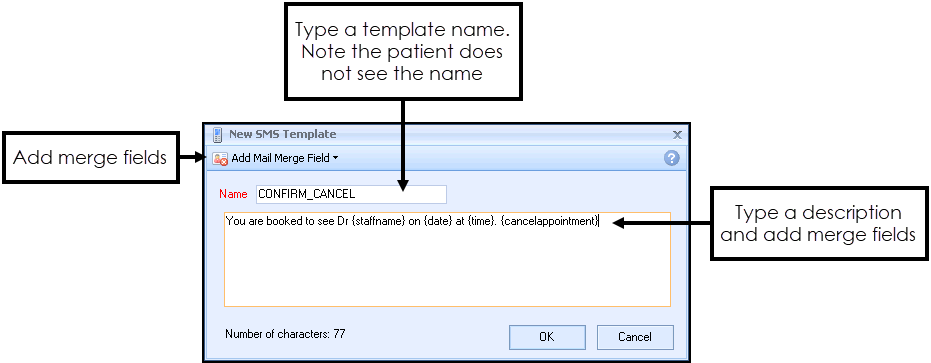 - Name - Enter a name so that you can distinguish your template type in the Merge Templates screen. The patient does not see this when they receive the text message.