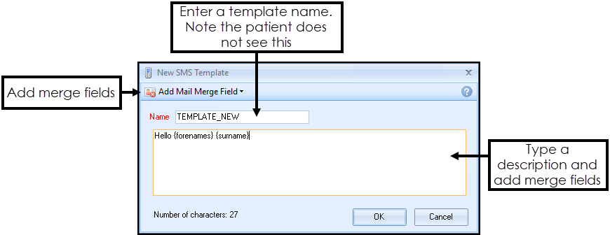 - Select OK to save the message. This is added to the Merge Templates list and can be used again for any future SMS messages of the same type.