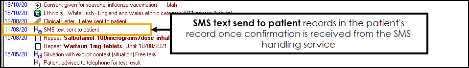 Once Vision+ receives confirmation from the SMS handling service that the message is sent, a clinical term automatically records to the patient's record: