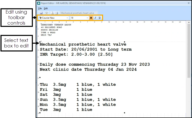 To edit the size of the text on the report, select the text box and edit using the controls on the toolbar: