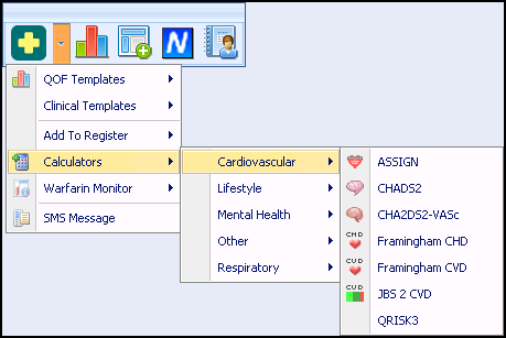 There are numerous integrated calculators and questionnaires available within Vision+ to assist with the management of patient care. These are easily accessed from the Vision+ menu on the floating toolbar in Consultation Manager.