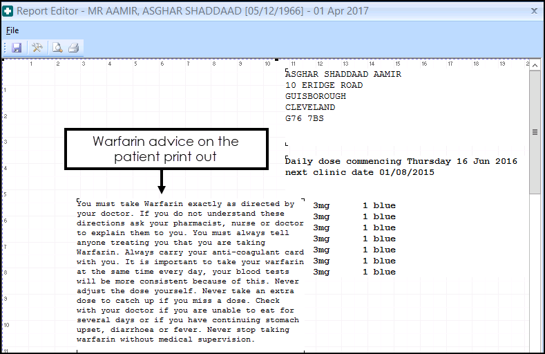 You can print a report which contains information on the patients dosing regime, including which colour tablets they need to take on which days. The weekly Warfarin dose history is also displayed for the previous 5 values. Contained within the report is general information regarding taking Warfarin. The report is designed to be printed out so that it can be given to the patient or any other clinician who may potentially need an overview, for example if the patient changes practice.
