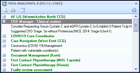 .Note - By default QOF alerts display when you select a patient in Consultation Manager. To combine both QOF and non-QOF alerts, see Options - Indicators. - The Alert screen displays the CKD Manager sub-category headings expanded to show relevant data:
