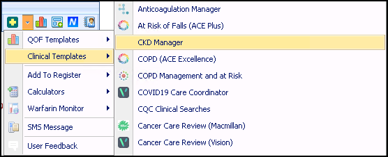 2. From the Vision+ floating toolbar , select Clinical Templates and then select CKD Manager: