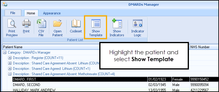 - Highlight a patient and select Show Template.