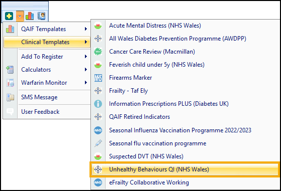 , select Clinical Templates and then select Unhealthy Behaviours QI (NHS Wales):