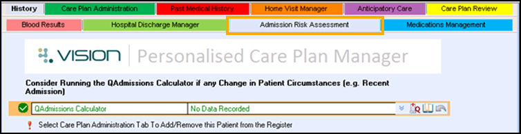 The Admissions Risk Assessment tab displays the patient's QAdmissions Risk score history. The QAdmission score can either be run on a group of patients or on an individual patient. For more information on running the QAdmission Risk Stratification tool on a group of patients, see the Unplanned Admissions Outcomes Manager Getting Started User Guide.