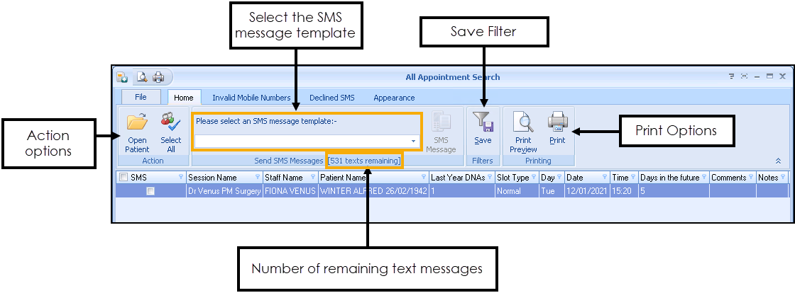 . Patients with an invalid mobile number or dissent recorded can be viewed and mobile numbers updated in the respective tabs. See Appointment Search Screen Overview for more information. - Select SMS Message