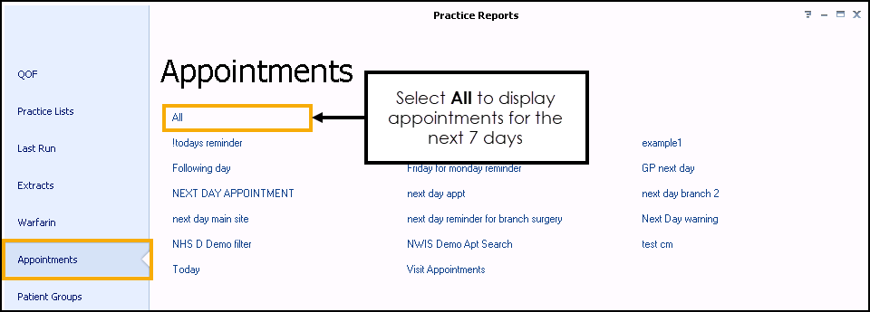 Patients with appointments for the next 7 days display by default and we will use this as a basis to send our SMS message. The screen displays the following: