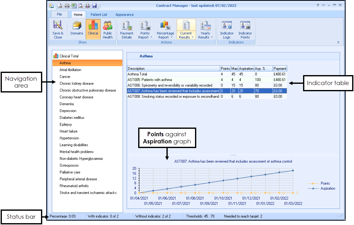 Status bar - The status bar at the bottom of the screen is a very useful tool and shows some important information relating to point thresholds for the individual domains. The status bar displays the current Percentage, the number of patients With indicator, the number of patients Without indicator, the upper and lower Thresholds for the indicator (%) and the number Needed to reach target. Towards the end of the contract period the number needed to reach the target can play a vital role when allocating resources for the practice to attain the maximum points possible for each category.