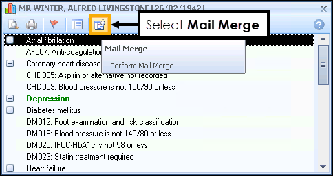 - From Consultation Manager, select your patient, select the relevant line from the alert window and then select Mail Merge