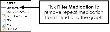 Filter Medication - By default repeat medication is filtered to the relevant BNF chapters. Remove the tick to display all repeat medication, for instance to see whether medication not specifically prescribed for this condition is, nonetheless, having an effect upon it.