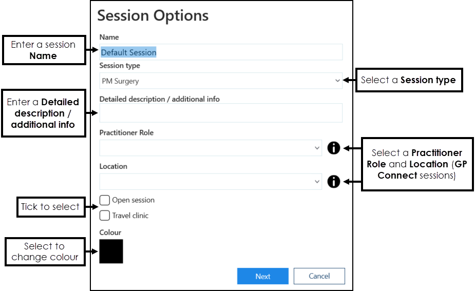 - Name - Enter an appropriate session name, for example Dr Smith AM, Nurses PM surgery, Ante-Natal Clinic. This name displays when listing available sessions and on the Reception View so should be appropriate, a maximum of 30 characters.