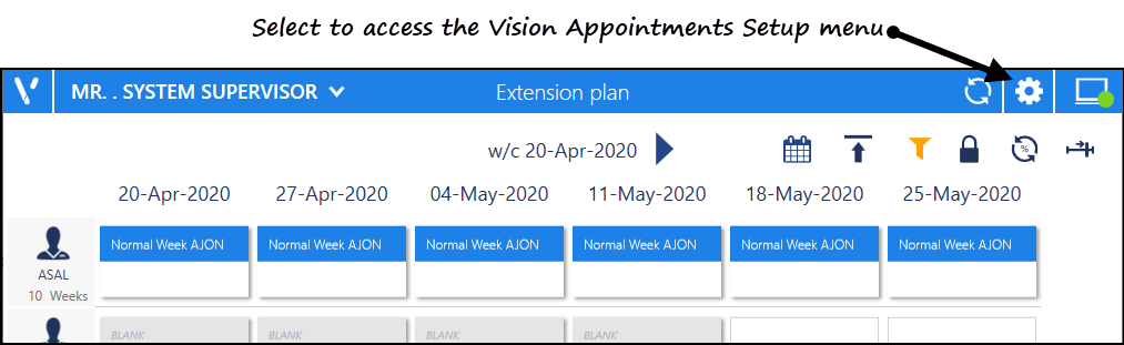 On start up, Appointments Setup displays your Extension plan, this provides an overview of the weekly plans and optionally, appointment utilisation details.