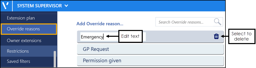 Training Tip - You can drag and drop the reasons into the order you want them to be presented. If your list of reasons is too long to fit on your screen, you can search for one using Search Override reasons.