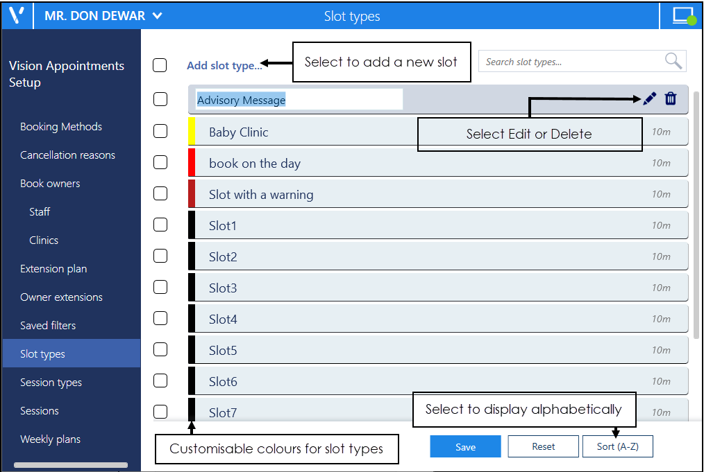 The slot types define different types of appointments which can have various availabilities and lengths and are colour coded for easy identification: