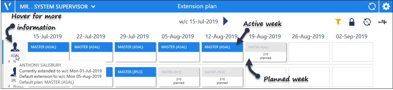 The Extension plan shows each clinician and their active plan by week: