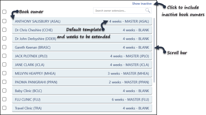 Selecting Owner extensions, from the Appointments Setup menu, displays all active book owners, their default weekly plan and how far in advance their appointments can be booked.