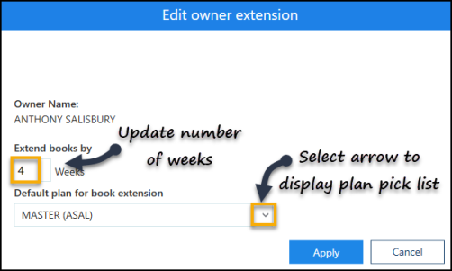 The Edit owner extension popup activates. - To set the number of weeks you wish the books to extend, by enter a value in the Weeks box.