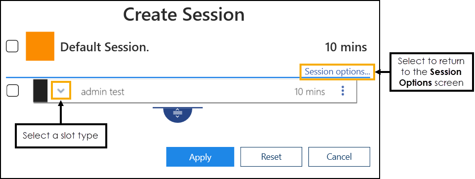 Select Apply to save your changes, Reset to return to the Session Options screen, or Cancel to cancel the new session.