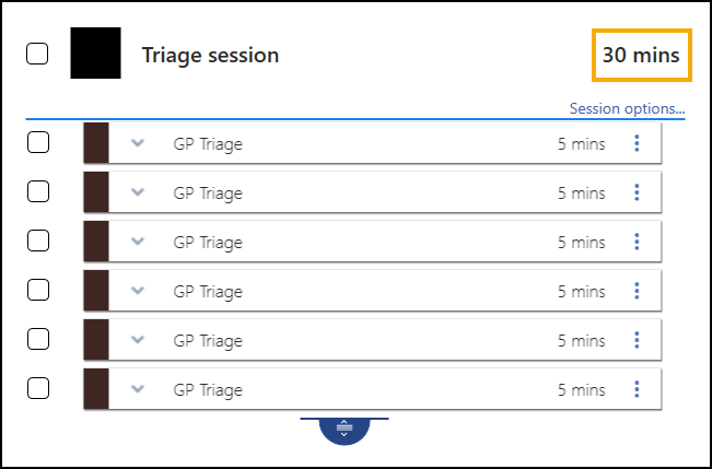 to extend the surgery using the chosen slot type. The session duration automatically updates as you move the drag handle. You can now update any slot types if required, you can also change more than one slot type at once, see Editing Sessions for further details. - If you are creating a pattern of slots, for example, two normal and one telephone, extend the session to three slots, select the slot combination, tick Use selection as pattern, and then click, hold and drag the drag handle